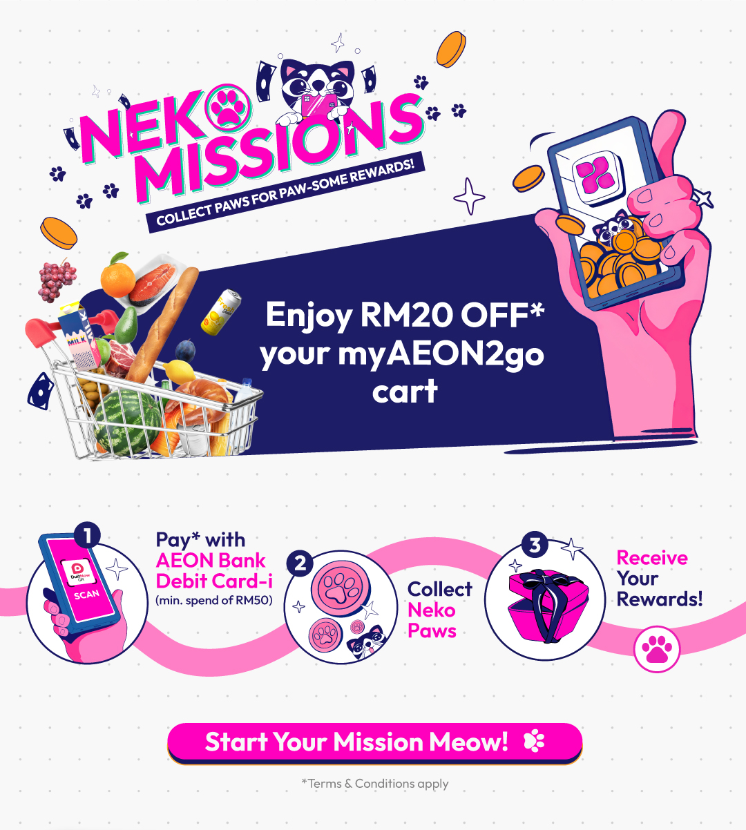 Please read the terms and conditions herein on the AEON Bank Neko Mission - RM20 myAEON2go voucher (“Mission”) that is featured on the AEON Bank Application and/or the AEON Bank website (“Terms and Conditions”). These Terms and Conditions govern your participation in the Mission. By participating in the Mission, you agree to be bound by these Terms and Conditions and any other related terms and conditions.