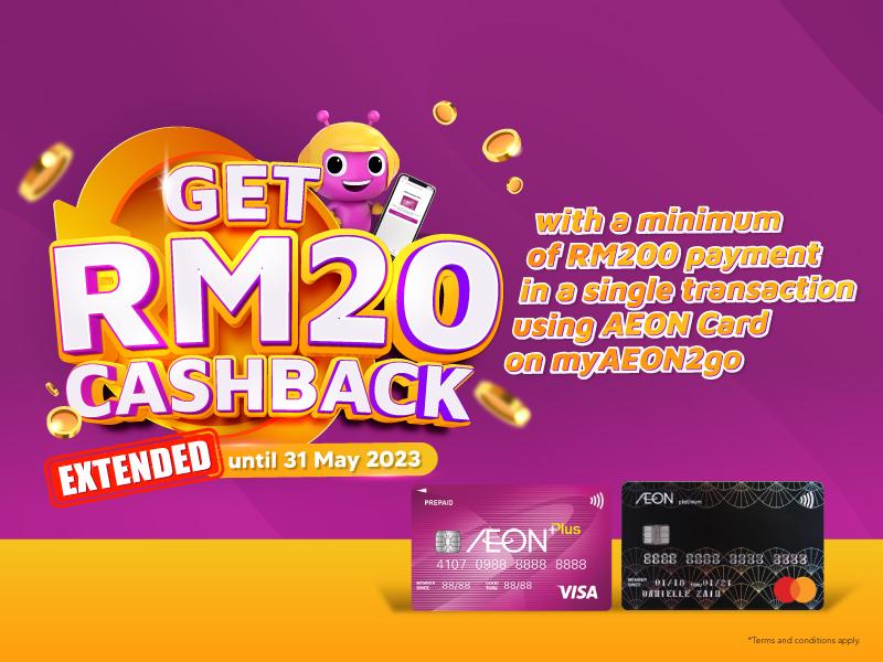 Get RM20 Cashback with AEON Cards (“Campaign”) is organized by AEON Co. (M) Berhad (“AEON”) and AEON Credit Service (M) Berhad (“AEON Credit”) which will commence from 1st May 2023 until 31th May 2023 (“Campaign Period”).
